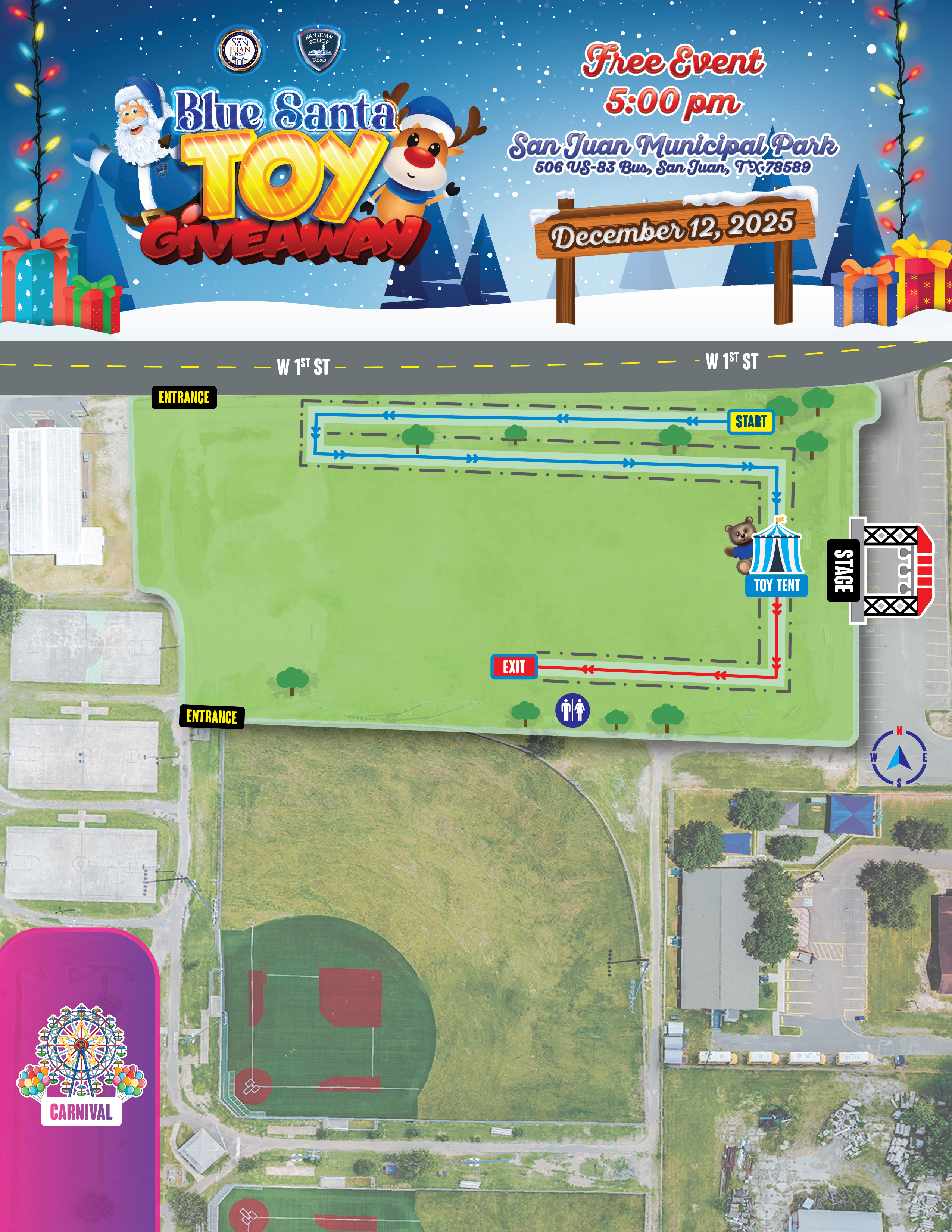 Our Annual FREE Blue Santa Toy Giveaway is officially set for Friday, December 12th, at the San Juan Municipal Park at 5 PM.