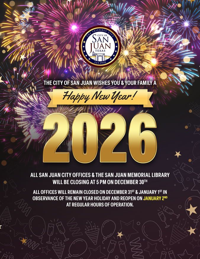 City Offices & Library New Year Holiday Closures 2025-12-29T22:32:35+00:00December 29, 2025| The City of San Juan wishes you and your family a safe and happy New Year!