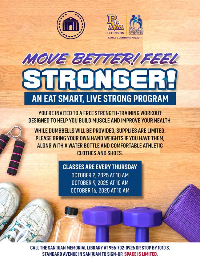 Join the San Juan Memorial Library for a FREE Eat Smart, Live Strong Program, a strength-training workout designed to help you build muscle, boost your energy, and improve your health!